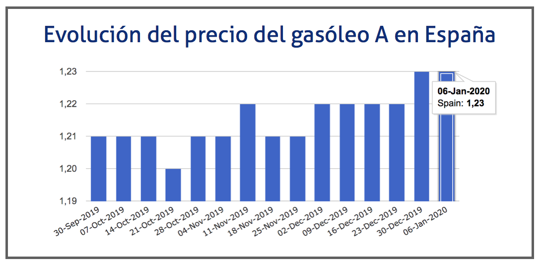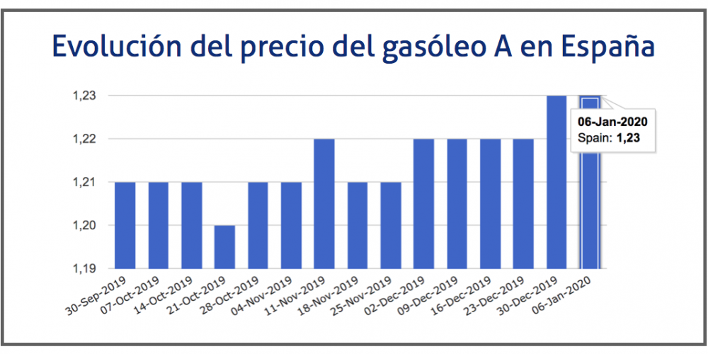 Entre la primera semana de enero de 2020, el precio del gasóleo se ha situado en los 1,247 euros, lo que supone un aumento del 2,12% respecto a los 1,221 euros de la semana antes de Navidad. Se trata de su nivel más elevado desde el mes de junio de 2019.