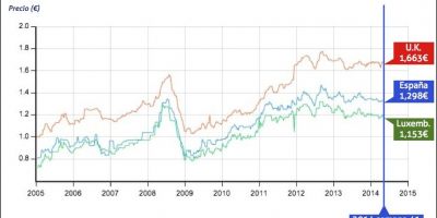 El precio de los carburantes sigue siendo menor en España con respecto a la media de la UE, donde el precio de venta al público del litro de gasóleo se sitúa en 1,385 euros y en 1,357 en la zona euro. Por su parte, el litro de gasolina alcanza los 1,541 euros de media en la UE de los 28 y 1,565 en la eurozona.