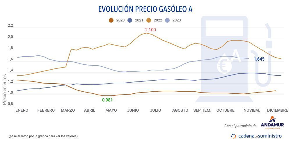Ambos combustibles siguen por debajo del importe que marcaban antes de la entrada en vigor de la ayuda que aprobó el Gobierno a finales de marzo de 2022, y que fue prorrogada por el Gobierno hasta finales de 2023 para el transporte profesional por carretera. No obstante, el descuento, desde el 30 de septiembre hasta final de año, es de cinco céntimos.