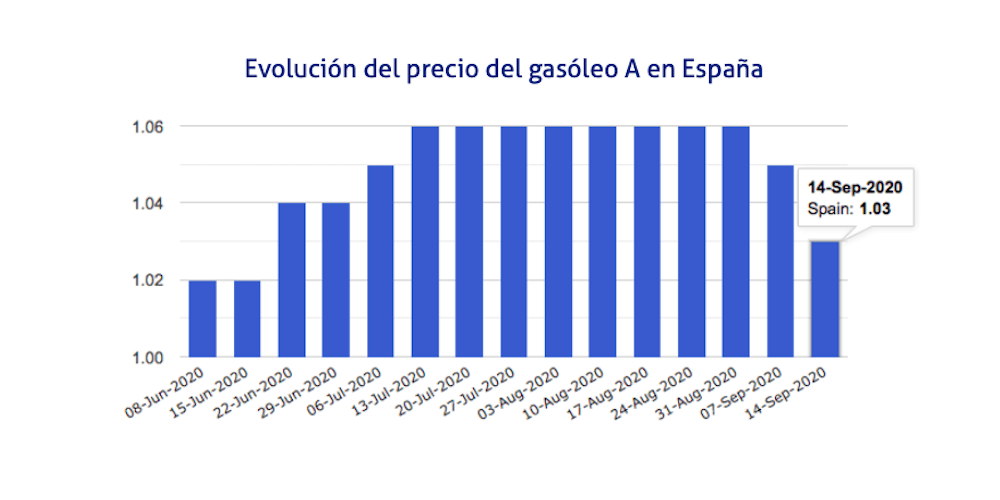 Entre los días 8 y 14 de septiembre de 2020, el precio del gasóleo ha alcanzado los 1,040 euros, lo que supone un descenso del 1,32% respecto a los 1,054 euros de la semana anterior. Se trata de su tercera caída consecutiva, con lo que se sitúa ya un 16,59% por debajo de los 1,247 euros de la primera semana del año.