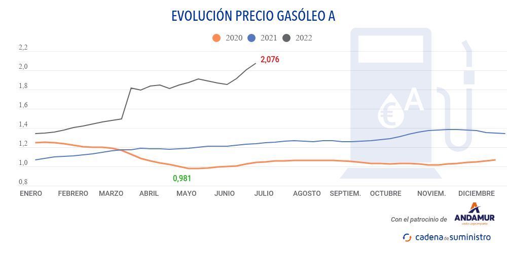 El precio del gasóleo se ha afianzado en España por encima de los dos euros por litro, pues entre los días 14 y 20 de junio ha pasado de los 2,003 a los 2,076 euros. Esto supone un incremento del 3,64% y un nuevo récord histórico, según recoge el último Boletín Petrolero de la Unión Europea.