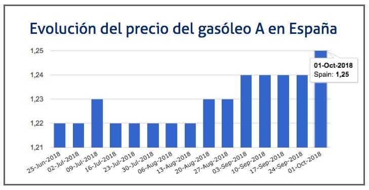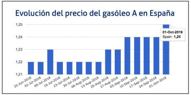 El precio del litro de gasóleo ha alcanzado entre los días 25 de septiembre y el 1 de octubre de 2018 los 1,250 euros. La cifra se sitúa un 0,48% por encima de los 1,244 euros de la semana anterior, cuando se redujo por primera vez tras ocho semanas al alza.