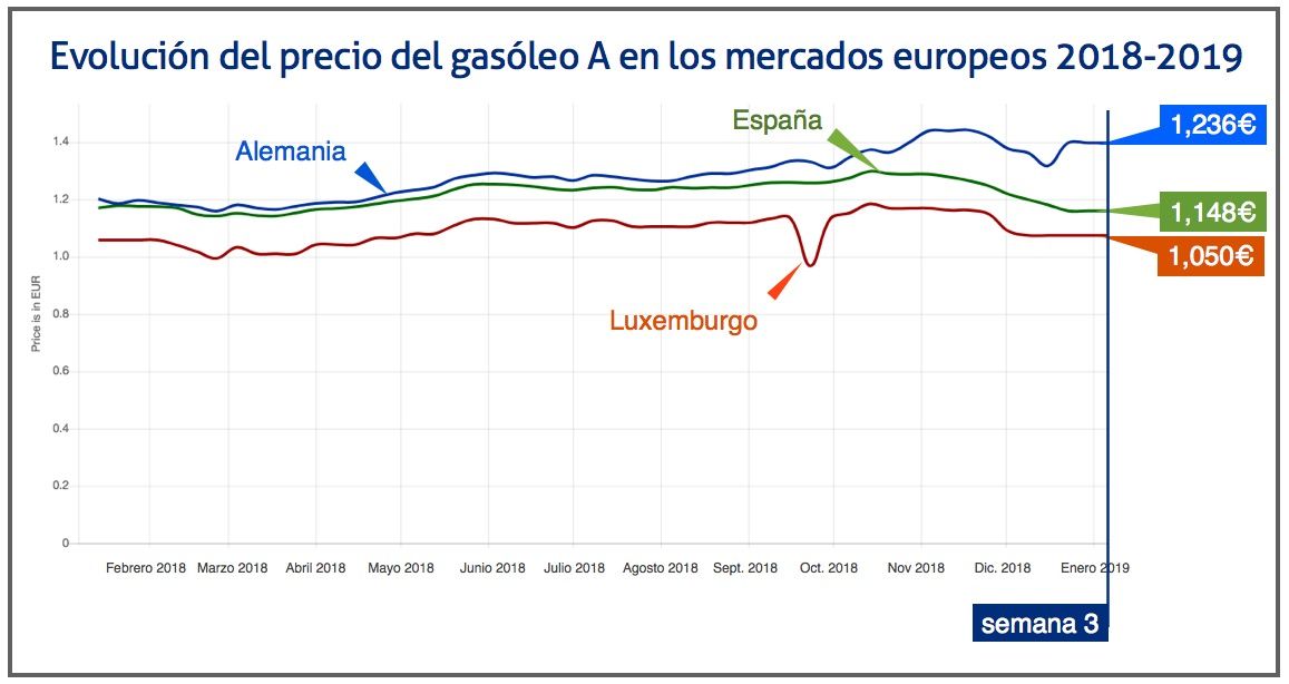 El precio del gasóleo se ha situado entre los días 8 y 14 de enero de 2019 en los 1,148 euros, lo que implica un aumento del 1,68% respecto a los 1,129 que marcaba la semana anterior. De este modo, pone fin a una tendencia bajista que lo había llevado a reducirse un 12% desde los máximos alcanzados en octubre de 2018.