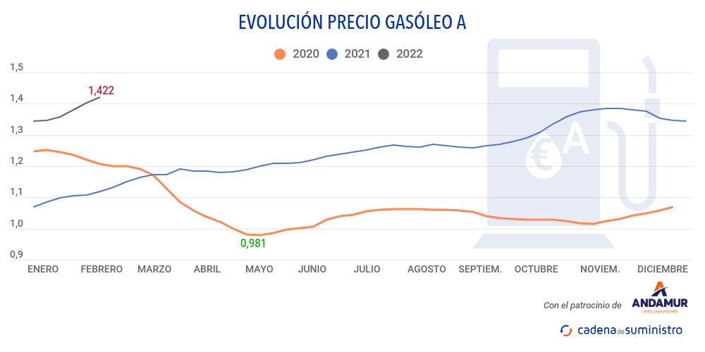 El precio del gasóleo se ha situado en los 1,422 euros entre el 25 y el 31 de enero, según los datos proporcionados por el Boletín Petrolero de la Unión Europea. Esto supone un incremento del 1,35% respecto a la semana anterior, cuando se encontraba en los 1,403, que lo sitúa cada vez más cerca del máximo alcanzado para este combustible, situado en 1,444.