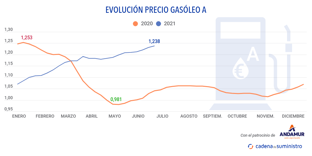Entre los días 15 y el 21 del mes de junio de 2021, el precio del gasóleo se ha situado en los 1,238 euros, tocando así nuevos máximos anuales al superar en un 0,56% los 1,231 euros por litro de la semana anterior, según los datos proporcionados por el Boletín Petrolero de la Unión Europea.
