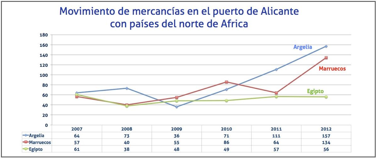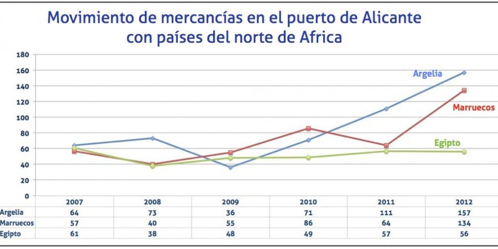 Las nuevas oportunidades de mercado del puerto de Alicante, en opinión de Ripoll son los tráficos con el norte de África “y así lo demuestran las cifras. El tráfico con Argelia ha aumentado entre el 2009 y el 2012 un 334,9%, con una evolución muy superior a la de los tráficos”.