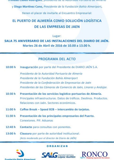 Jaén acoge este mes de abril la presentación de los principales servicios logísticos que ofrecen en la provincia los puertos de Almería y Carboneras. Así, se darán a conocer las principales líneas regulares de transporte marítimo, así como las conexiones que ofrece el recinto para constituirse como solución logística de las empresas cargadoras de Jaén, tanto exportadoras como importadoras.