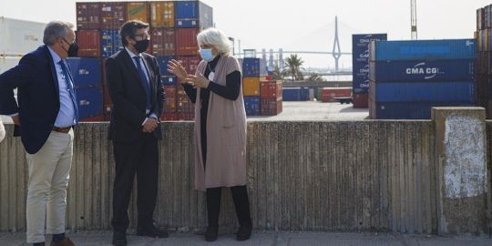 La presidenta del puerto, Teófila Martínez, y su director, J. Agustín Romero, le han trasladado de primera mano el estado actual del acceso en túnel a la Nueva Terminal de Contenedores, de la licitación de la adjudicación de la explotación de la segunda fase y del acceso ferroviario a La Cabezuela-Puerto Real y a la Nueva Terminal de Contenedores.