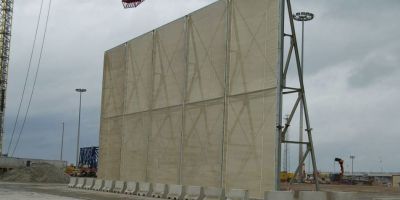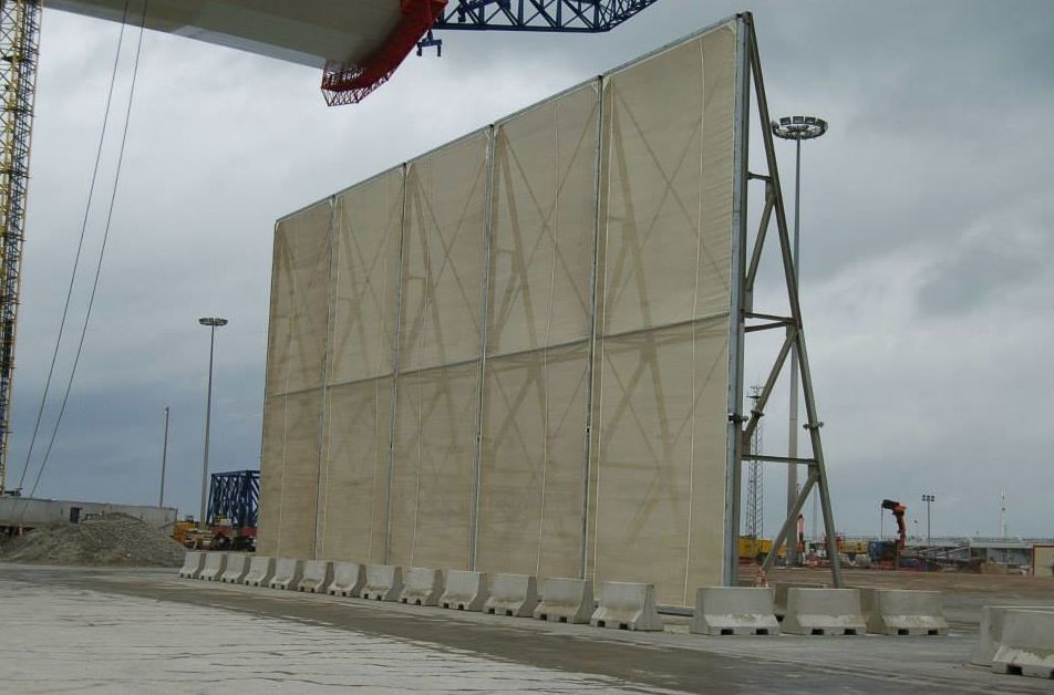 Las pantallas están formadas por tres módulos de 25 m, con 11,5 m de altura, dispuestos en forma de L y orientados de tal forma que cuando sopla el viento de Poniente las partículas son frenadas por las pantallas y cuando el viento viene de Levante, se reduce la velocidad del mismo al impactar contra las barreras evitando la disgregación de las mercancías.