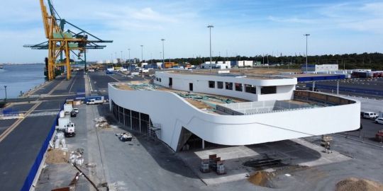 La Autoridad Portuaria de Huelva está ultimando la construcción del edificio multifuncional en el Muelle Sur, que acogerá una terminal para embarque y desembarque de pasajeros, así como espacios para albergar los servicios portuarios y de control e inspección de Policía y aduanas.