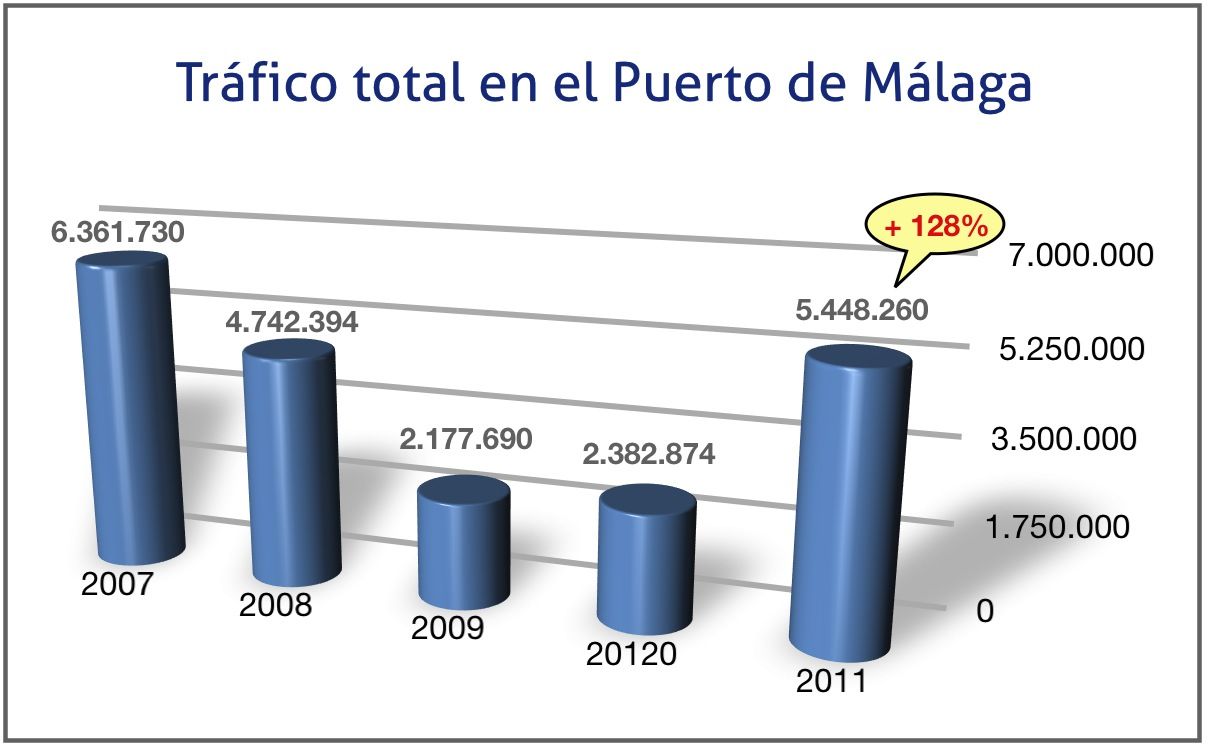 El Puerto de Málaga concluye el ejercicio 2011 con un récord histórico en el número de buques que han operado en el mismo. El tráfico total del puerto con 5.448.260 Tn, aumentó un 128% con respecto a 2010, superando ampliamente el doble del tráfico movido, y poniendo de manifiesto que Málaga es el puerto español que mayor crecimiento ha experimentado respecto al año anterior, alcanzando cifras situadas entre 2007 y 2008.
