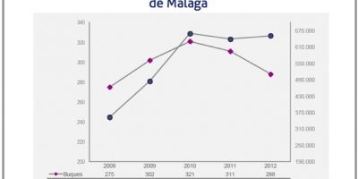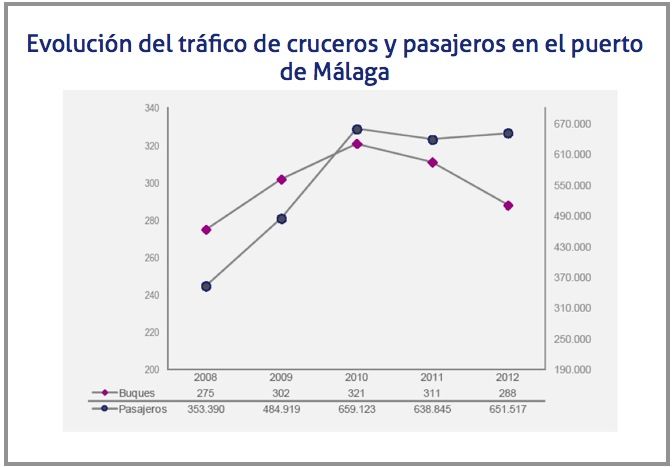 Durante el pasado año 2012, el puerto de Málaga recibió un total de 651.517 pasajeros a bordo de 288 buques de crucero, representando una cuota del 8,6% sobre el cómputo de cruceristas que visitaron España en buques de crucero durante 2012.