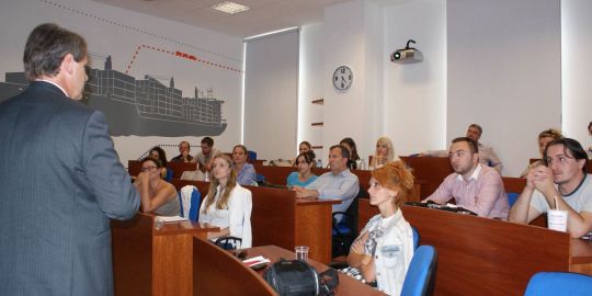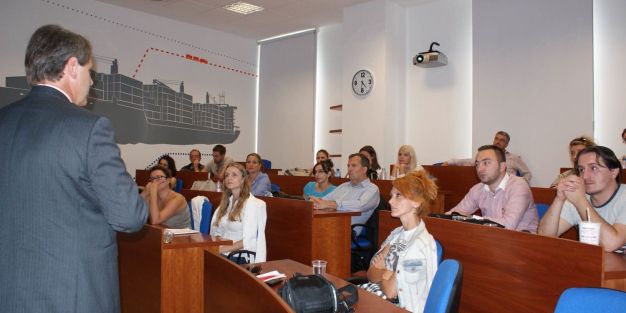 En su desplazamiento al puerto de Valencia, la delegación de Macedonia mantuvo una sesión de trabajo con representantes de Fundación Valenciaport. La sesión comenzó con una presentación del puerto de Valencia, para continuar explicando los objetivos y fines de la organización, así como los proyectos más relevantes de I+D+i y de formación acometidos por la entidad durante el 2012. Para terminar se realizó una presentación del proyecto europeo MOS4MOS - Monitoring and Operation Services for Motorways of the Sea, financiado por el Programa TEN-T 2010.