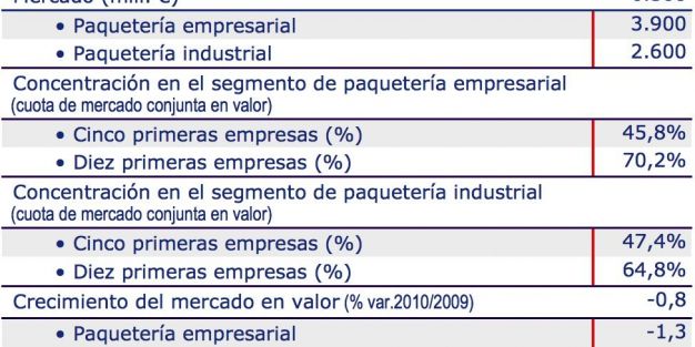 Las diez primeras empresas presentes en el segmento de paquetería empresarial alcanzaron en 2010 una cuota de mercado conjunta del 70%. Por su parte, las diez compañías con mayor facturación por servicios de paquetería industrial reunieron el 65% del volumen de negocio.