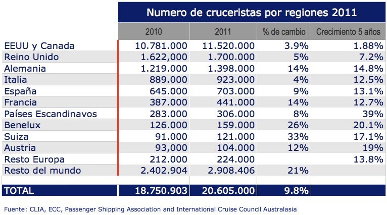 A nivel mundial el número de cruceristas ha aumentado en 2011 un 10%, respecto al año anterior, alcanzando los 20 millones de pasajeros.