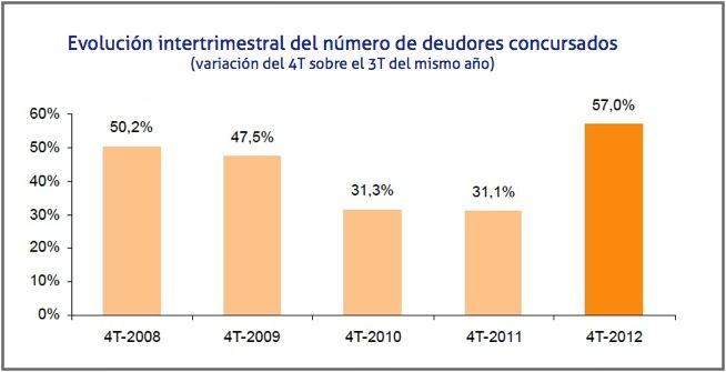Cabe destacar que la variación trimestral del número de deudores concursados entre el tercer y cuarto trimestre de 2012 ha sido del 57,0%. Esta variación es la más elevada de los últimos cinco años.