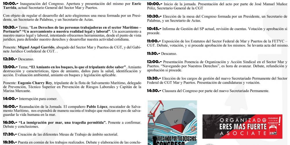 En este contexto, el Sector Mar y Puertos de la Confederación General del Trabajo, CGT, convoca el Congreso Estatal 'Navegando por tus derechos', en el que se analizarán los problemas que afectan al sector y la situación actual de la estiba, tras la aprobación el pasado 24 de febrero del Real Decreto para su reforma.
