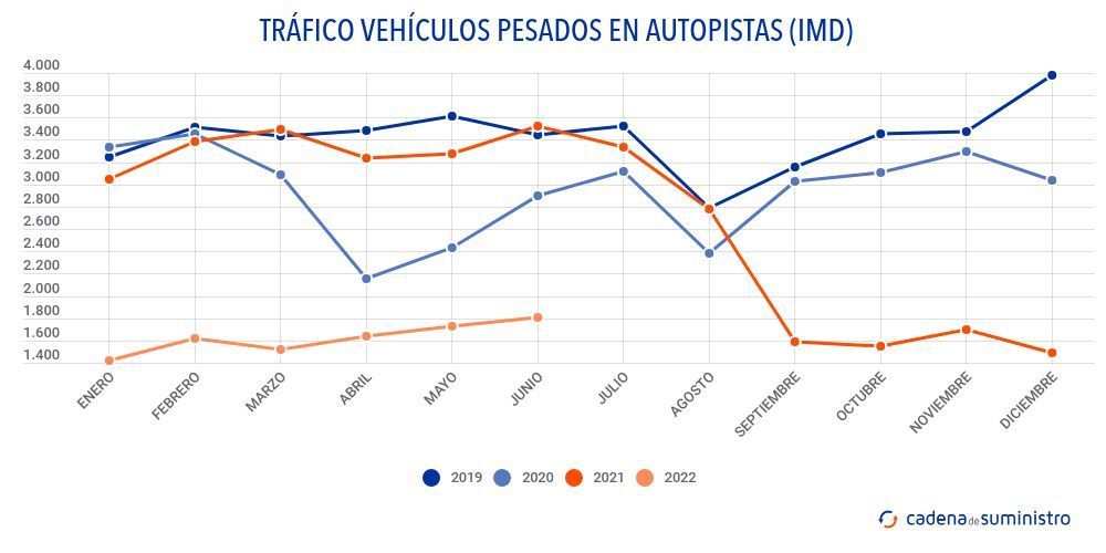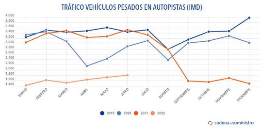 Dicha cifra indica que el tráfico pesado de las autopistas de peaje del país constituye el 11,86% del total de vehículos que han utilizado estas vías a diario durante el período, que, según los últimos datos reportados por el Ministerio de Transporte, Movilidad y Agenda Urbana, suma un total de 15.225 vehículos al día de media, cifra que, a su vez, implica una caída anual de un 26,2%.