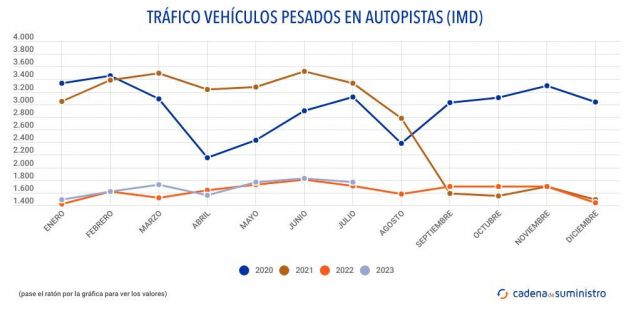 En este mismo sentido, durante el séptimo mes de 2023 se registró en las carreteras de pago del país un total de 78 millones de vehículos pesados kilómetro, un 4% más que durante el mismo período de 2022.