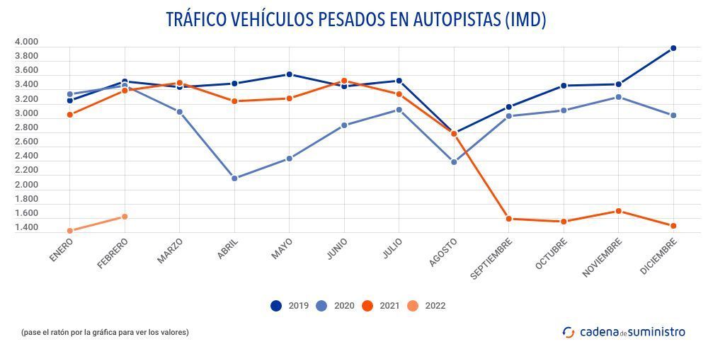 En este mismo sentido, el pasado mes de febrero se registró en las carreteras de pago del país un total de 65 millones de vehículos pesados kilómetro, un 63,89% menos que hace un año.