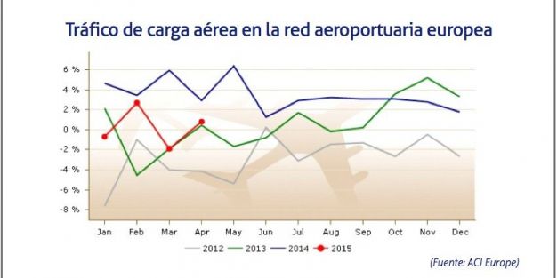 El tráfico de mercancías manipulado a través de la red aeroportuaria europea ha descendido durante hasta abril de 2015 un 0,1% con respecto al mismo periodo del ejercicio anterior. Sin embargo, en la variación intermensual, el tráfico ha ascendido un 1,8%, lo que ha frenado los descensos que se habían registrado durante los últimos meses.
