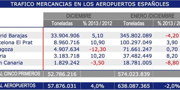 A pesar de estos buenos resultados, que se vienen produciendo desde octubre, Aena ha cerrado 2013 con un 2% menos en el tráfico de carga, con un total de 638.087.365 toneladas, tras encadenar durante todo el año caídas de hasta el 7,5%.