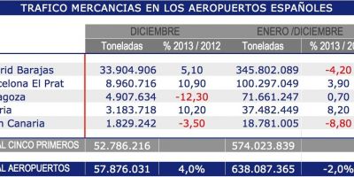 Por aeropuertos, el primero sigue siendo Madrid-Barajas, que ha registrado cifras positivas en el último mes de 2013. Así, ha concentrado más del 58% de toda la carga gestionada en la red de aeropuertos de Aena a lo largo del pasado mes, y las más de 33.900 toneladas de mercancías contabilizadas suponen un incremento del 5,1% en relación a diciembre de 2012. Sin embargo, el cómputo del año resulta negativo, con un 4,2% menos que en el ejercicio anterior, y un total de 345.802.089.