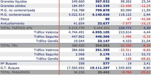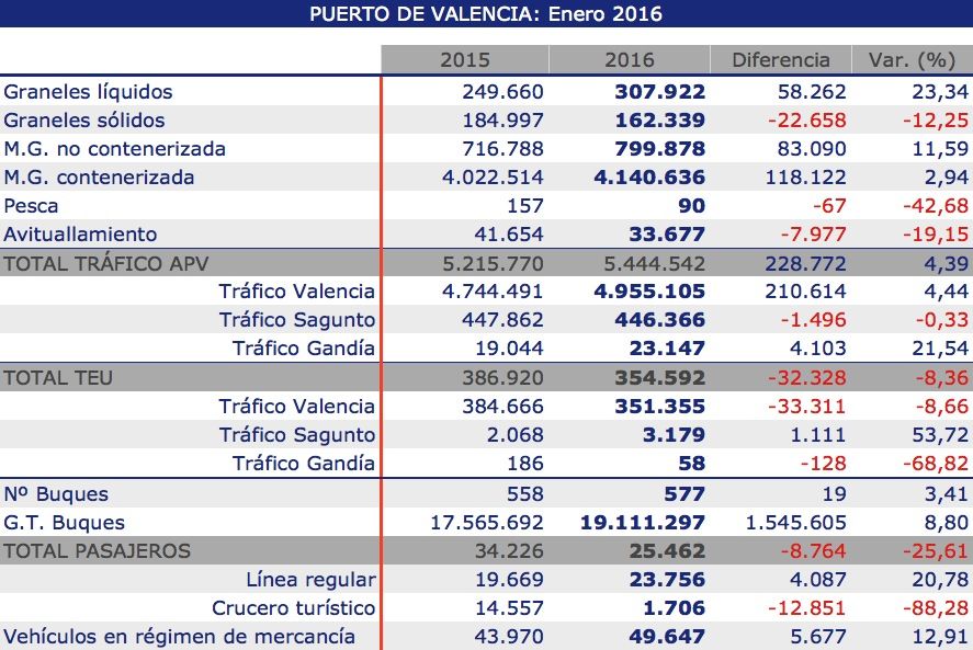 Los puertos dependientes de la Autoridad Portuaria de Valencia han manipulado un total de 5.444.542 tn en enero de 2016, lo que representa un incremento del 4,39% con respecto al primer mes del ejercicio anterior.