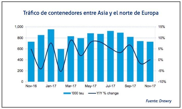 El nivel de crecimiento de la demanda en el tráfico de contenedores desde Asia hacia el norte de Europa ha descendido un 1,6% entre octubre y noviembre, con un incremento interanual prácticamente imperceptible del 0,1%, según el último informe de Drewry.