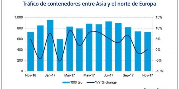 La consultora había anticipado una caída menos pronunciada para estos meses, teniendo en cuenta que las previsiones de crecimiento anual de septiembre eran del 4,9%. Sin embargo, entre enero y noviembre, los volúmenes entre ambas zonas han crecido un 4,2%, con 9,1 millones de TEUs.