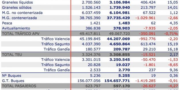 La Autoridad Portuaria de Valencia ha canalizado 49.067.720 toneladas en el acumulado hasta el mes de septiembre. Esta cifra representa una contracción del 0,71% respecto al mismo periodo de 2012. Según el boletín estadístico correspondiente al mes de septiembre, el tráfico de contenedores retrocede un 1,57% hasta los 3.272.342 deTEUs.