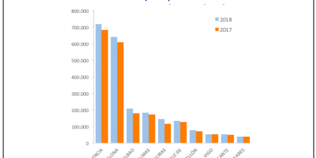 En abril de este mismo año, el sistema portuario español ha movido 1.402.587 TEUs, un 6,08% más que en idéntico mes de 2017, así como 5.452.369 TEUs en enero y abril, un 10,53% más que en los cuatro primeros meses de este ejercicio.