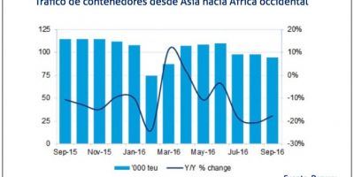 El movimiento de contenedores en la región refleja la desaceleración económica, que está afectando en mayor medida a las principales economías de la región. Hasta septiembre de 2016, el tráfico desde los países asiáticos hacia la zona de África occidental ha descendido un 11%.