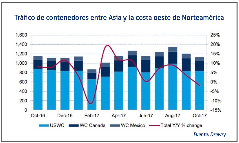 Se han cancelado algunas escalas en las rutas entre Asia y la costa oeste norteamericana, pero la capacidad ha seguido aumentando en torno al 10% en los últimos meses de 2017 y seguirá haciéndolo en enero de 2018.