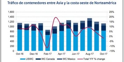 En el tercer trimestre de 2017, el tráfico de contenedores en estas rutas ha repuntado un 6,7%, pero los volúmenes han caído un 1,9% en octubre, lo que ha reducido la media anual al 5%. Se espera que en enero, las exportaciones hacia el este vuelvan a aumentar, debido a que los importadores necesitarán realizar sus pedidos antes de que las fábricas cierren con motivo de las festividades del Año Nuevo chino en febrero.