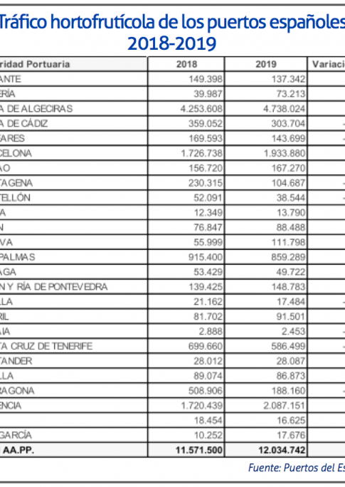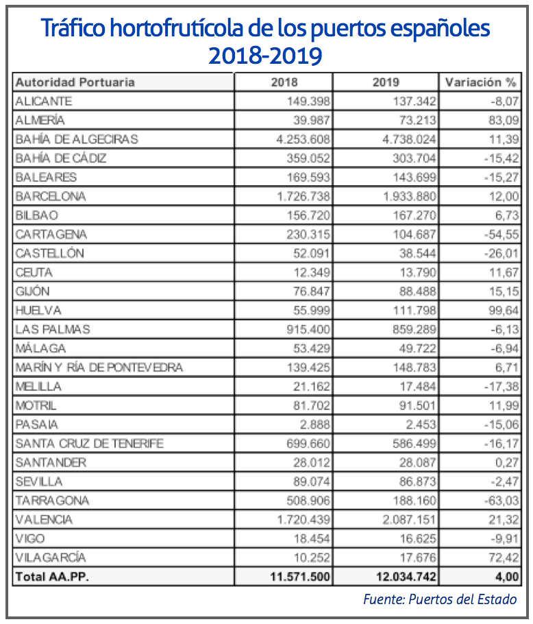El sistema portuario español ha movido el pasado 2019 un total 12.034.742 toneladas de frutas y verduras, cifra que supone un crecimiento de un 4% con relación a 2018, cuando se alcanzaron las 11.571.500 toneladas.
