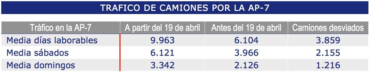 De esta forma, desde el pasado viernes 19 de abril, en el último mes el tráfico de camiones por la autopista AP-7, en el tramo entre Maçanet de la Selva y la frontera francesa, se ha incrementado más del 60% respecto al mes anterior, antes de que se aplicara la prohibición de circulación.