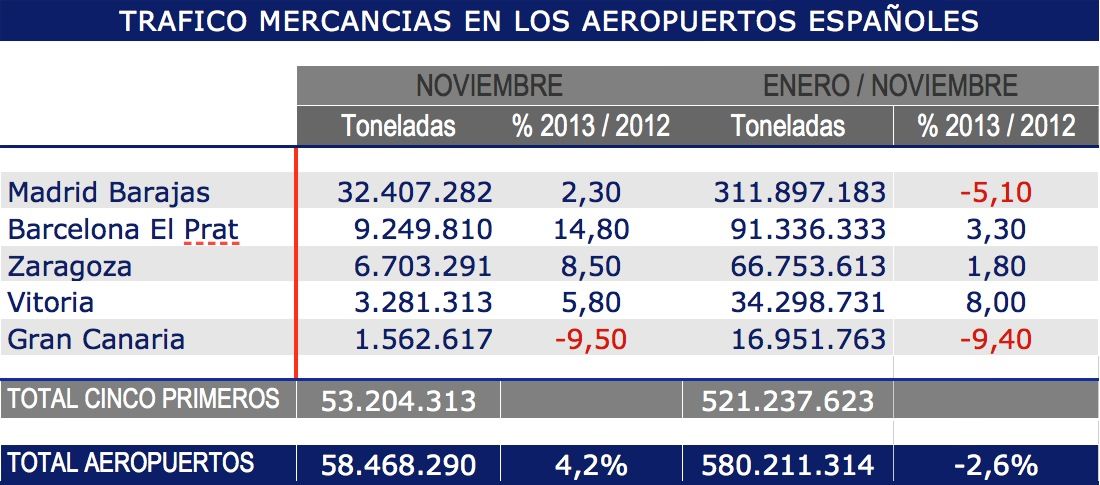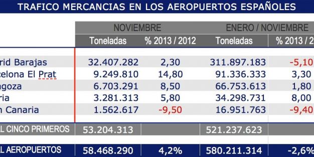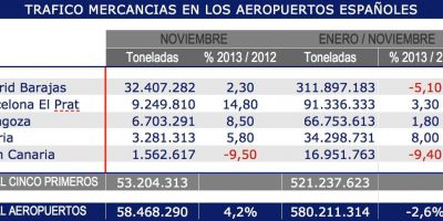 Por segundo mes consecutivo, el tráfico de mercancías en los aeropuertos españoles de la red Aena crece. En esta ocasión lo ha hecho en un 4,2% con respecto a noviembre de 2012, con un total de 58.468.290 toneladas de volumen de carga.