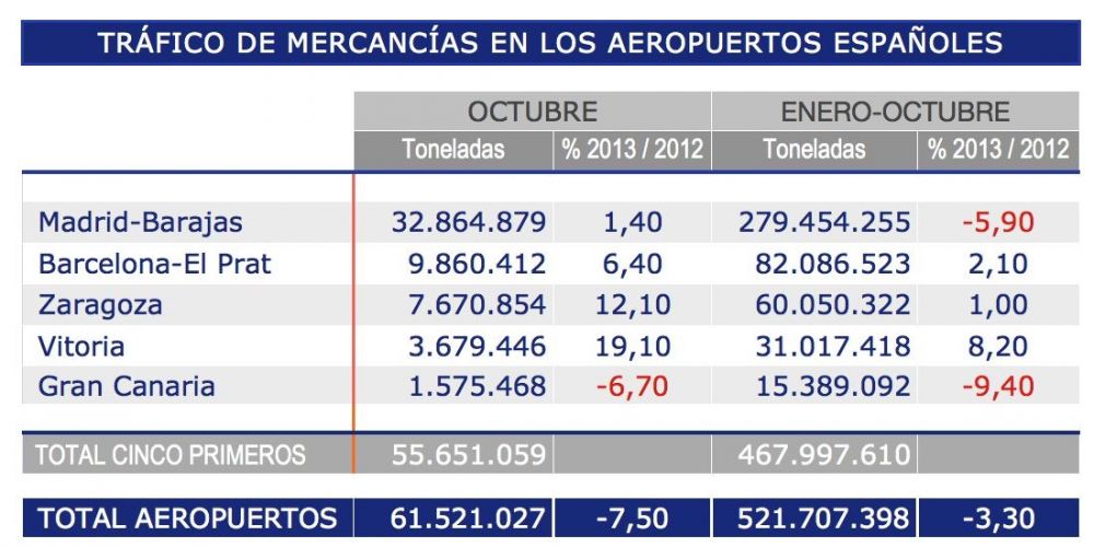 El tráfico de mercancías en los aeropuertos españoles de la red Aena, ha crecido un 3,7% con respecto a octubre de 2012, con un total de 61. 521 toneladas de volumen de carga.