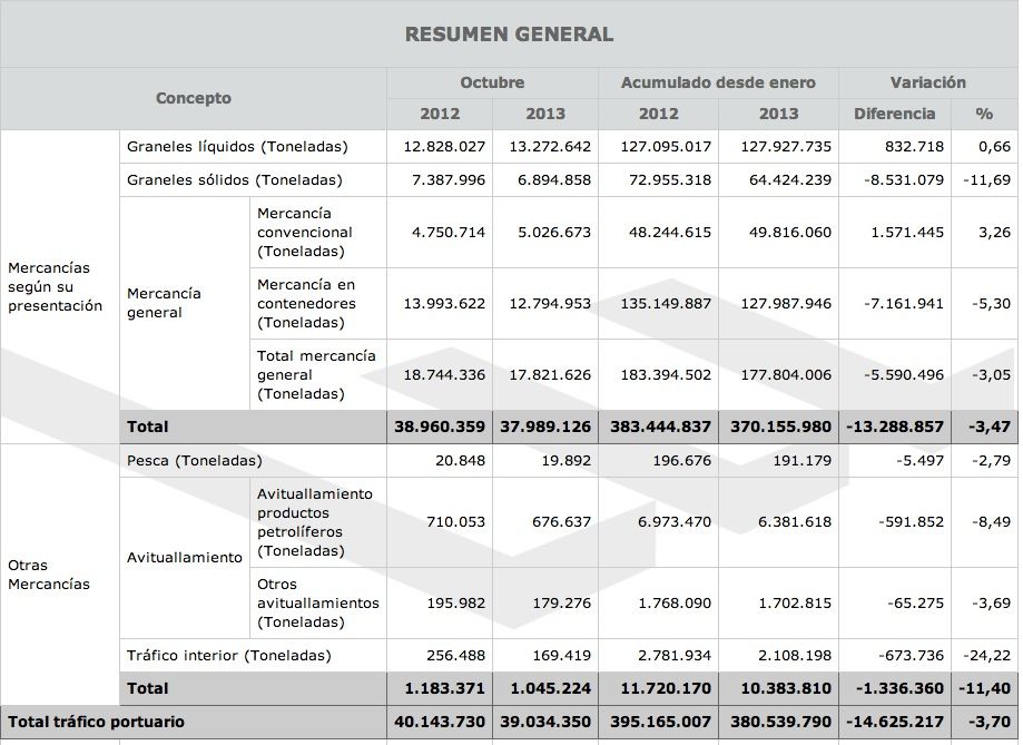 Si se descuentan las mercancías en contenedores en tránsito, se movieron 291,8 Mt, lo que supone un descenso del 1,8% respecto al mismo periodo de 2012. Por su parte, el movimiento de mercancías en contenedores en tránsito cayó, hasta octubre, un 9,2%.