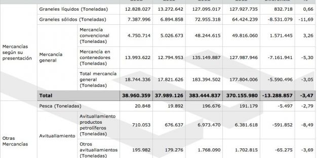 El tráfico total de mercancías aumentó un 6,2% en Bilbao y un 3,4% en Algeciras descendiendo en todos los demás puertos importantes, ligeramente en Barcelona y Valencia (-0,9% y -1,9%, respectivamente), algo más acusadamente en Cartagena y Huelva (-3,4% y -6,3%) y muy notablemente en Tarragona (-17,0%).
