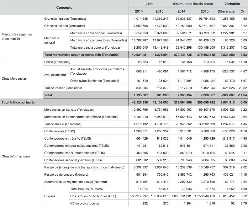Los puertos españoles de interés general han gestionado un total de 279.663.715 tn de mercancías durante los siete primeros meses de 2015, lo que supone un incremento del 3,53% con respecto al mismo periodo del ejercicio anterior.