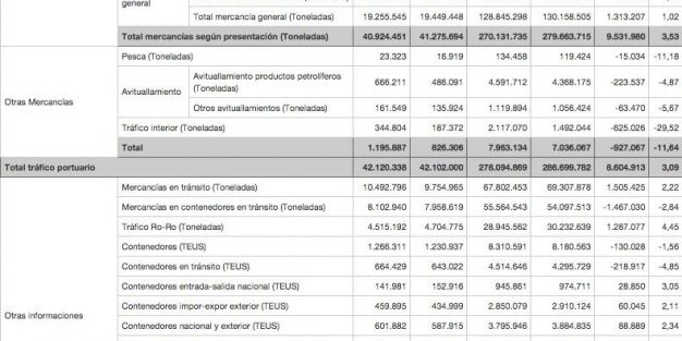 No obstante, los mayores crecimientos se han experimentado en el puerto de Almería, donde el tráfico ha crecido un 16,8%, en el puerto de Marín, donde lo ha hecho un 14,9%, y en el de Gijón, que ha experimentado un aumento del 12,2%.
