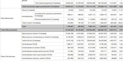 En lo que respecta a las 28 autoridades portuarias, Algeciras continúa liderando el ranking en toneladas manipuladas, con 55,4 millones de toneladas, seguida de Valencia, con 41,6 millones, y Barcelona, que ha manipulado 26,8 millones de toneladas de mercancías.