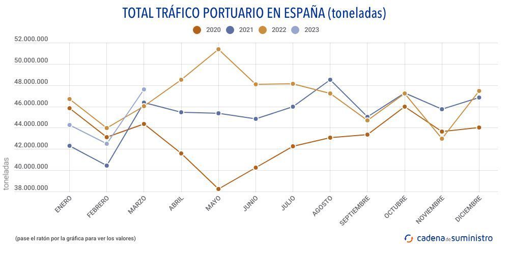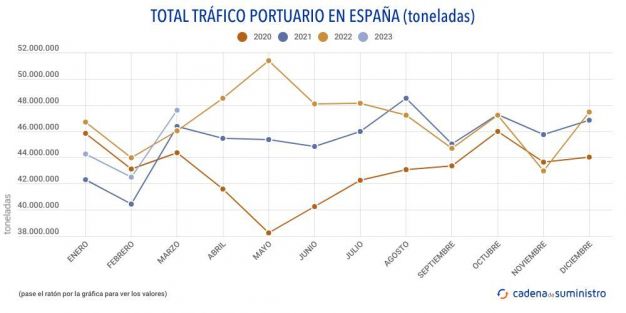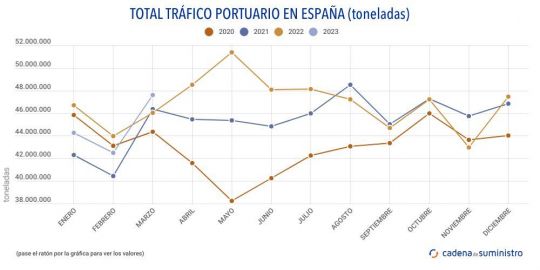 Los puertos españoles han movido en el mes de marzo un total de 47.616.630 toneladas, un 3,6% más que en el mismo mes de 2022, cuando se manipularon 45.967.891 toneladas.