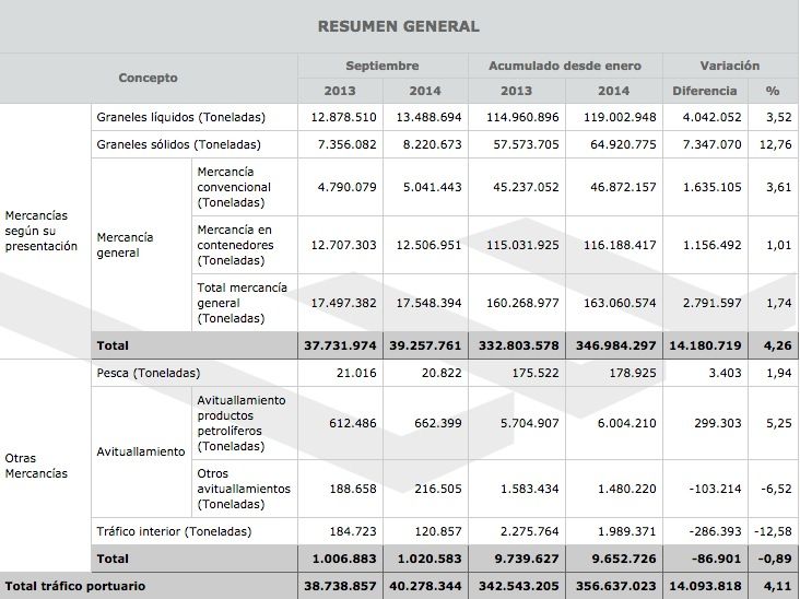 El tráfico total portuario registrado en los 46 puertos de titularidad estatal que coordina Puertos del Estado alcanzó las 356.637.023 toneladas movidas durante los nueve primeros meses del año, lo que supone un incremento del 4,1% respecto al mismo periodo de 2013.