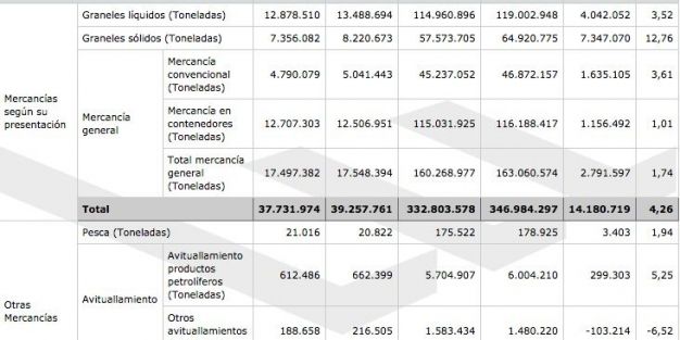 La mercancía general sigue siendo la forma de presentación más numerosa, especialmente en cuatro puertos, Bahía de Algeciras (46,1 millones de toneladas), Valencia (43,8 millones), Barcelona (20,6 millones) y Las Palmas (10,8 millones) manipularon cerca del 75% (121,4 millones de toneladas) del total nacional.