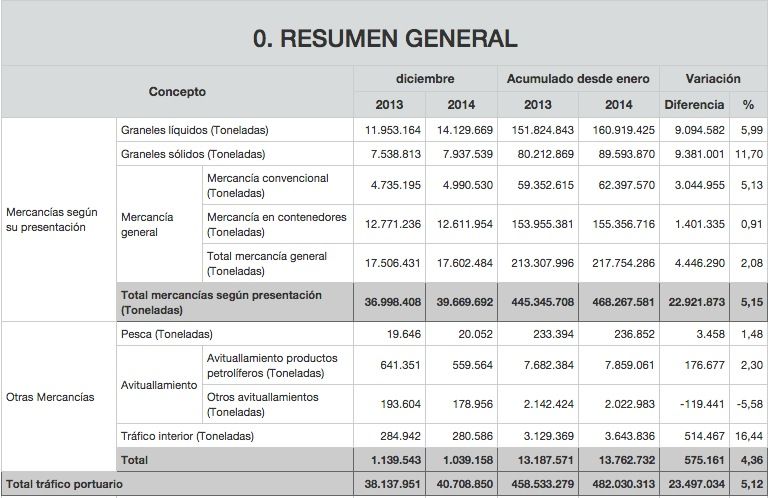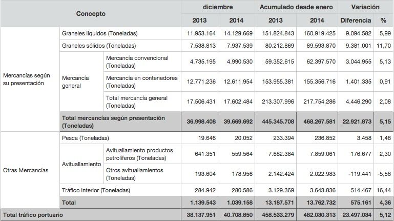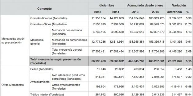 Igualmente, el tráfico ro-ro, vehículos industriales cargados de mercancías que viajan en barco, ha crecido un 8%, superando los 47,9 millones de toneladas, mientras el tráfico total de pasajeros se han mantenido en parámetros similares a 2013, con 28,7 millones de personas y 7,6 millones de cruceristas.