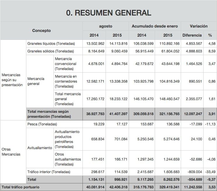 Los puertos españoles de interés general han gestionado un total de 321.156.765 tn de mercancías durante los ocho primeros meses de 2015, lo que supone un incremento del 3,91% con respecto al mismo periodo del ejercicio anterior.