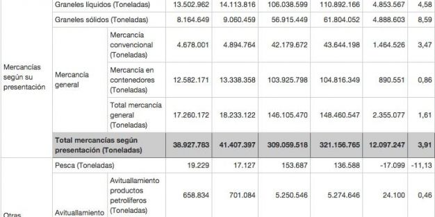 La mercancía general, con 148,4 millones de toneladas y un crecimiento del 1,6%, sigue siendo el tráfico con mayor peso. Le siguen en importancia los graneles líquidos que, con 110,8 millones de toneladas, han incrementado un 4,6%. Por su parte, los graneles sólidos han aumentado un 8,6% hasta 61,8 millones de toneladas.